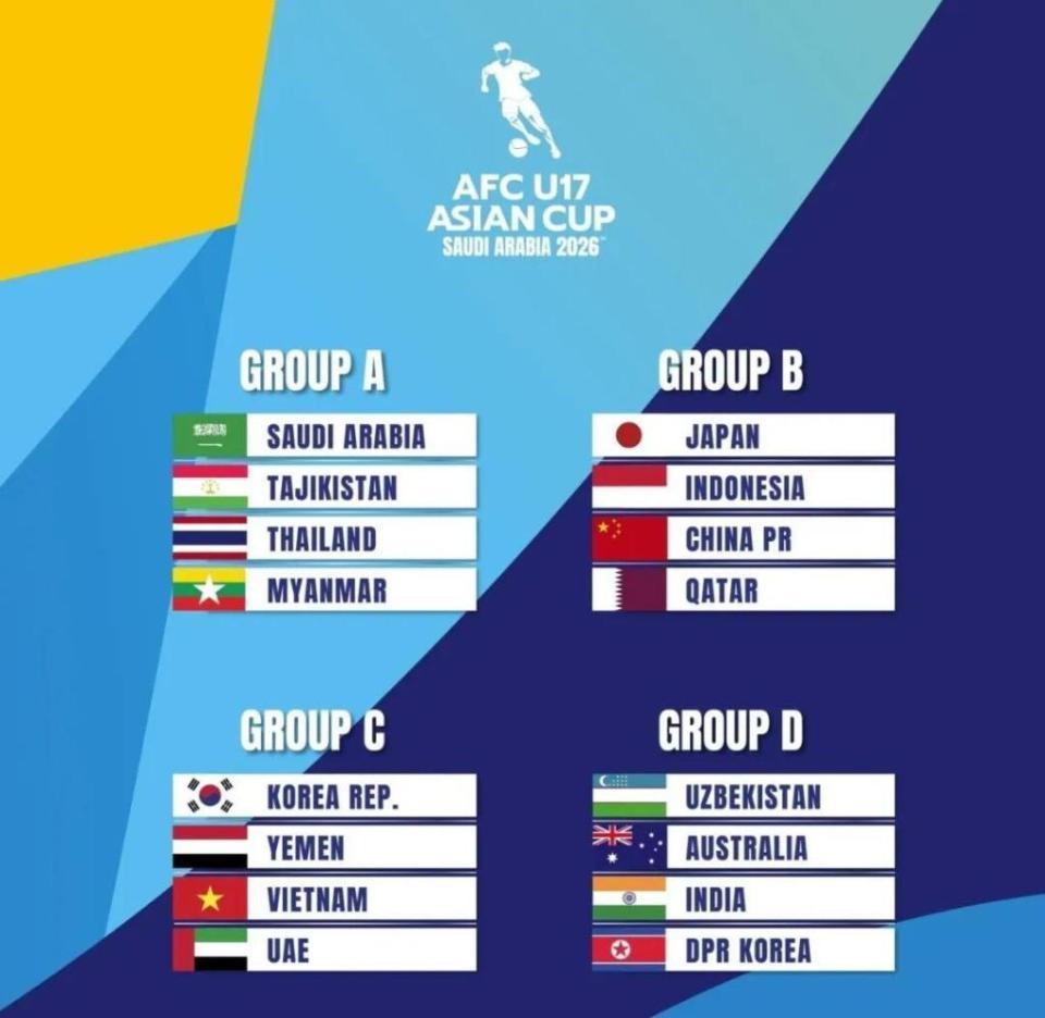 此前在U17亚洲杯预选赛中,中国队5战全胜以小组头名晋级,将于今年5月参加在沙特举行的U17亚洲杯正赛,中国队与日本队、印度尼西亚队、卡塔尔队同分在B组,小组前2名将直接锁定U17世界杯参赛资格。